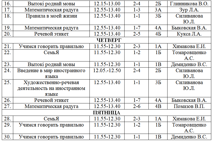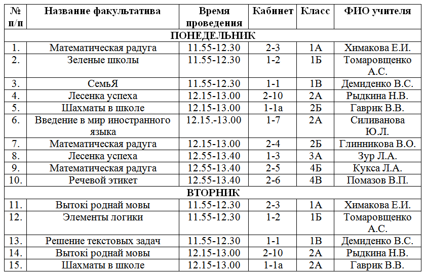 Расписание факультативных занятий РАСПИСАНИЕ ФАКУЛЬТАТИВНЫХ ЗАНЯТИЙна I полугодие 2025/2026 учебного года