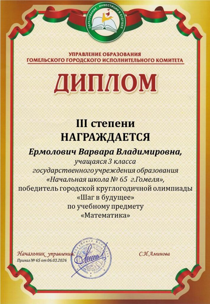 Поздравляем учащуюся ГУО «Начальная школа № 65 г.Гомеля» ЕРМОЛОВИЧ Варвару